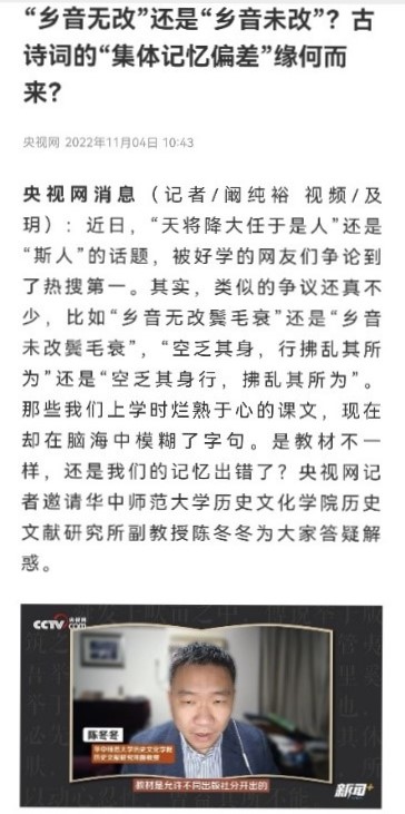 近日,历史文献所副教授陈冬冬接受央视网题为关于“‘乡音无改’还是‘乡音未改’?古诗词的‘集体记忆偏差’缘何而来”的访谈(https://news.cctv.com/2022/11/04/ARTIlxHsamUBB6jbTa8BXHqg221104.shtml)。11月4日,该访谈在在央视网播出。