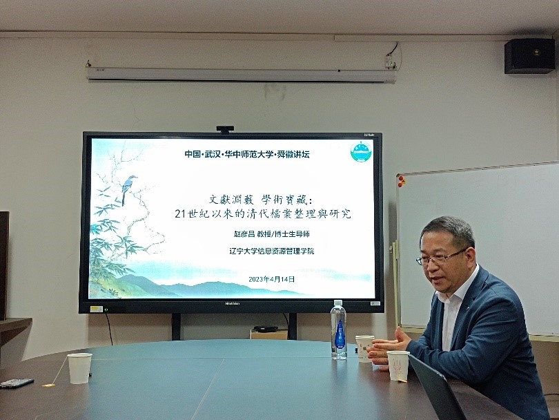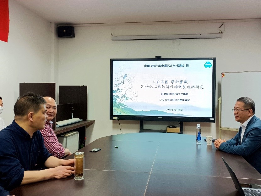 2023年4月14日晚,由华中师范大学历史文献学研究所及“文献学与经学史” 研究群主办的第四期“舜徽讲坛·学术讲座”,在科学会堂南楼历史文献所会议室顺利举行。讲座以“文献渊薮 学术宝藏:21世纪以来的清代档案整理与研究”为主题,由辽宁大学信息资源管理学院赵彦昌教授主讲。华中师范大学历史文献学研究所张固也教授主持本次讲座,历史文献学研究所黄珏教授、历史文化学院古代史教研室谢祺副教授、近代史教研室李明副教授出席了本次讲座。