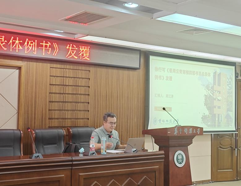 2024年5月24日下午3:00,由华中师范大学历史文化学院、历史文献学研究所、文献学与经学史研究群主办的第十一期“舜徽讲坛·学术讲座”(总第二十期),在逸夫楼一楼会议室顺利举行。讲座以“徐行可《答周云青商榷四部书目总录体例书》发覆”为主题,由首都师范大学文学院南江涛副教授主讲,华中师范大学历史文献学研究所樊宁讲师与谈。历史文献学研究所陈冬冬副教授主持本次讲座,历史文献学研究所黄政副教授,湖北省图书馆原副馆长徐力文,华中师范大学图书馆陈春玲等老师参加本次会议。